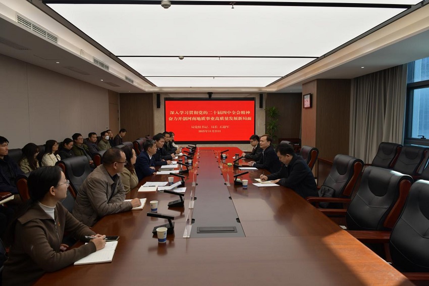 座谈会上,石迎军认真听取联系点党支部的党建和业务情况汇报,详细了解大家的工作和生活情况,对支部取得成绩给予充分肯定。随后,围绕学习领会习近平总书记重要讲话精神和全会审议通过的《中共中央关于制定国民经济和社会发展第十五个五年规划的建议》,以《深入学习贯彻党的二十届四中全会精神,奋力开创河南地质事业高质量发展新局面》为题,从“深刻认识‘十五五’规划建议的重大意义、准确把握‘十五五’规划建议提出的重要观点、扎实做好我局‘十五五’规划编制工作”等三个方面,对党的二十届四中全会精神进行系统阐释和深入解读。