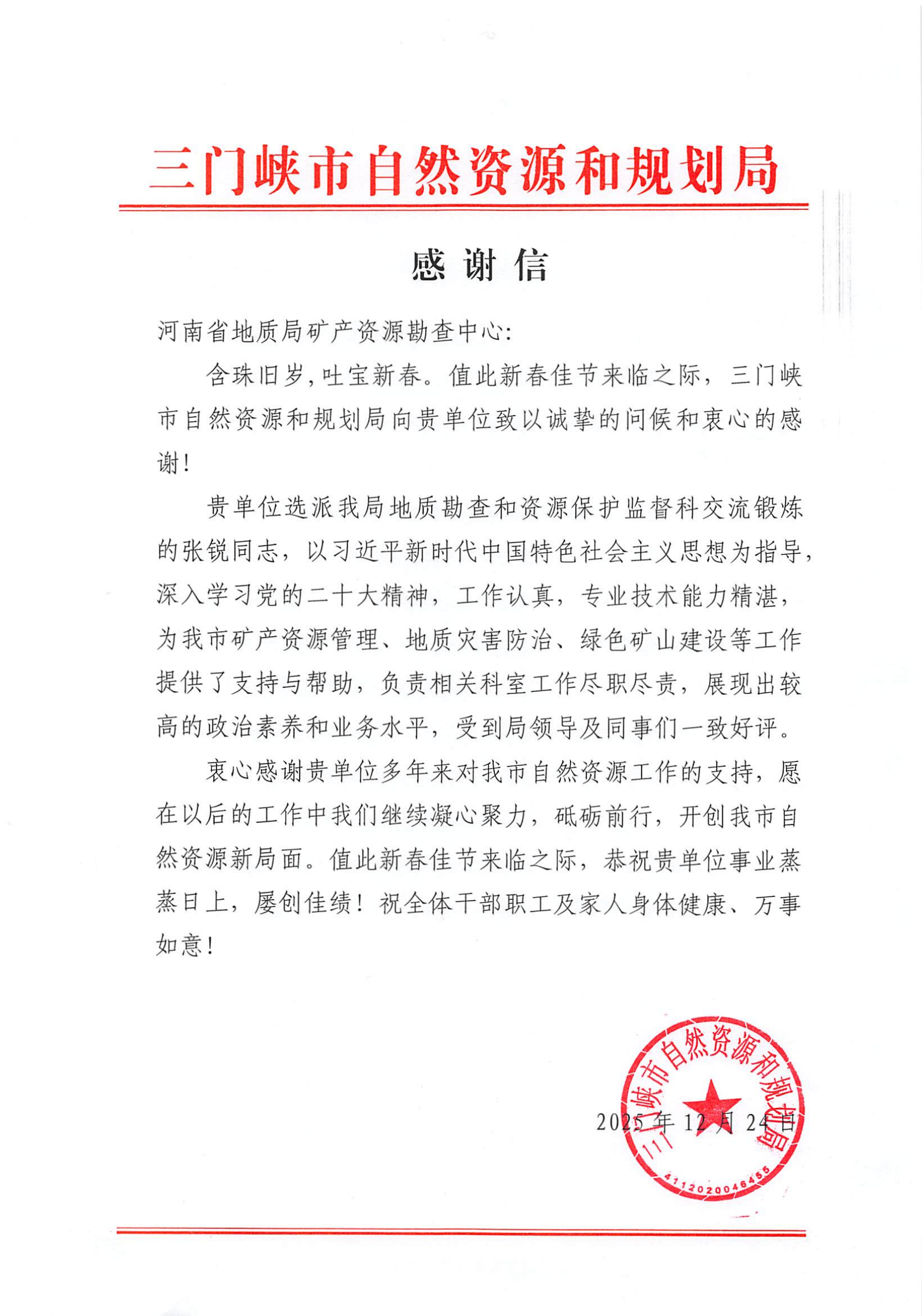 元旦将至,喜讯频传。近日,中心接连收到来自新疆塔城地区自然资源局、河南省自然资源厅以及郑州市、南阳市、三门峡市、淅川县等自然资源和规划局发来的感谢信。这一封封情真意切、赞誉有加的信件,不仅是对中心刘玉勇、宋利睿、葛俊涛、王浩宇、张雨沛、郝璐、曹涛、王胤博、张锐、张恒等同志个人辛勤付出与突出表现的充分肯定,更是对中心长期以来发挥专业技术优势,深度融入地方经济社会发展所取得成效的高度认可。