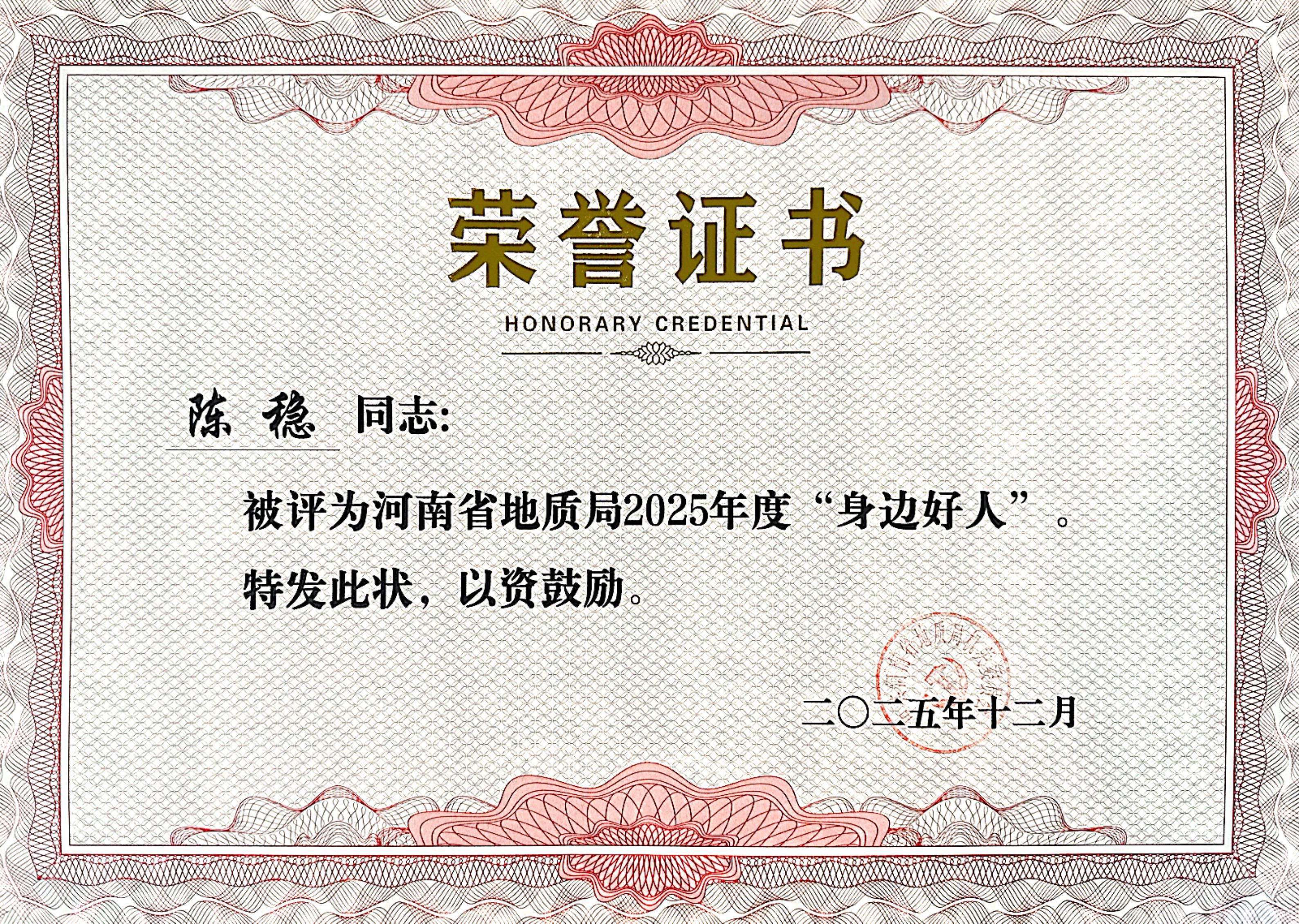 近日,中心地下空间探测研究所职工陈稳同志荣获省地质局2025年度“身边好人”荣誉称号。