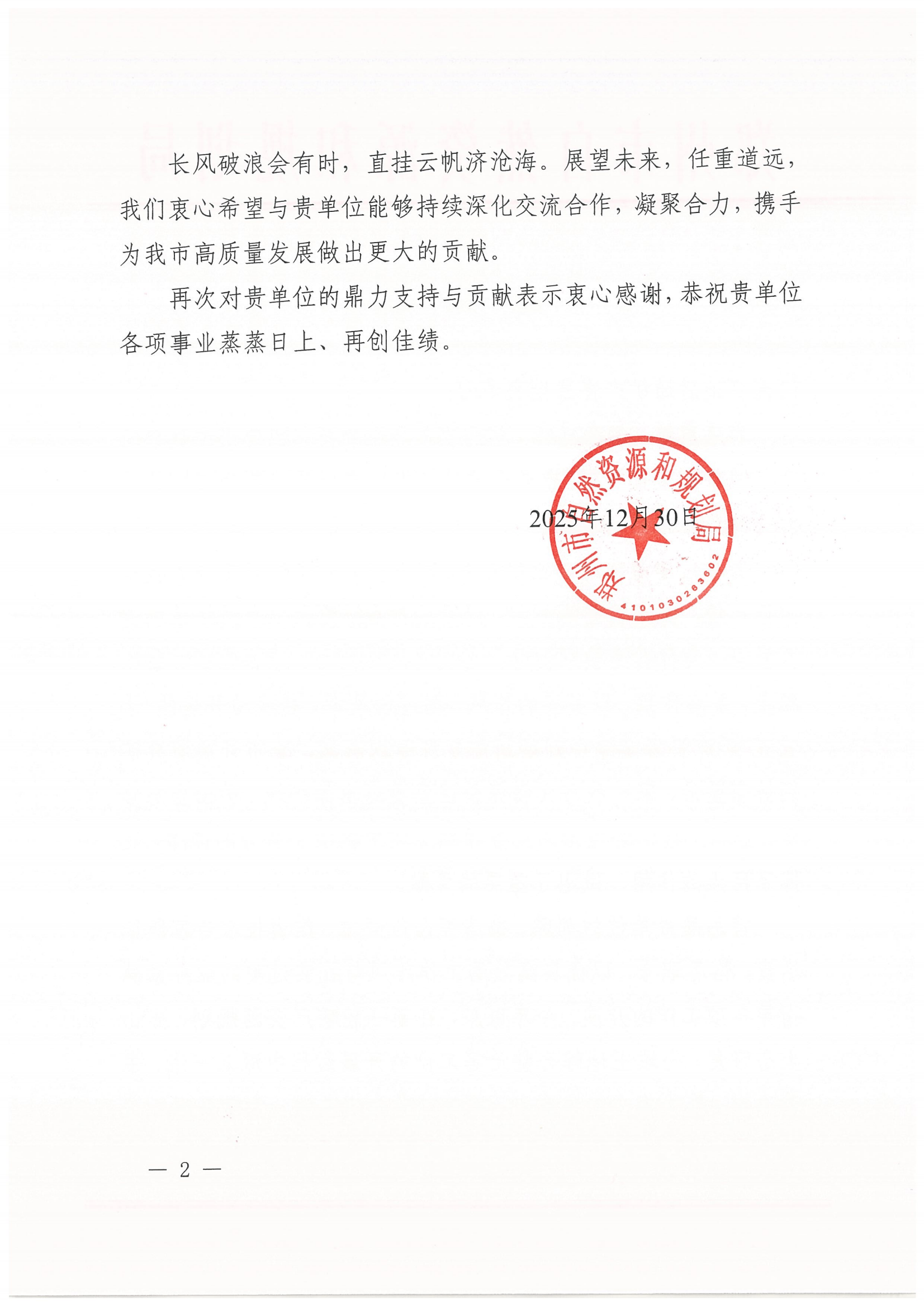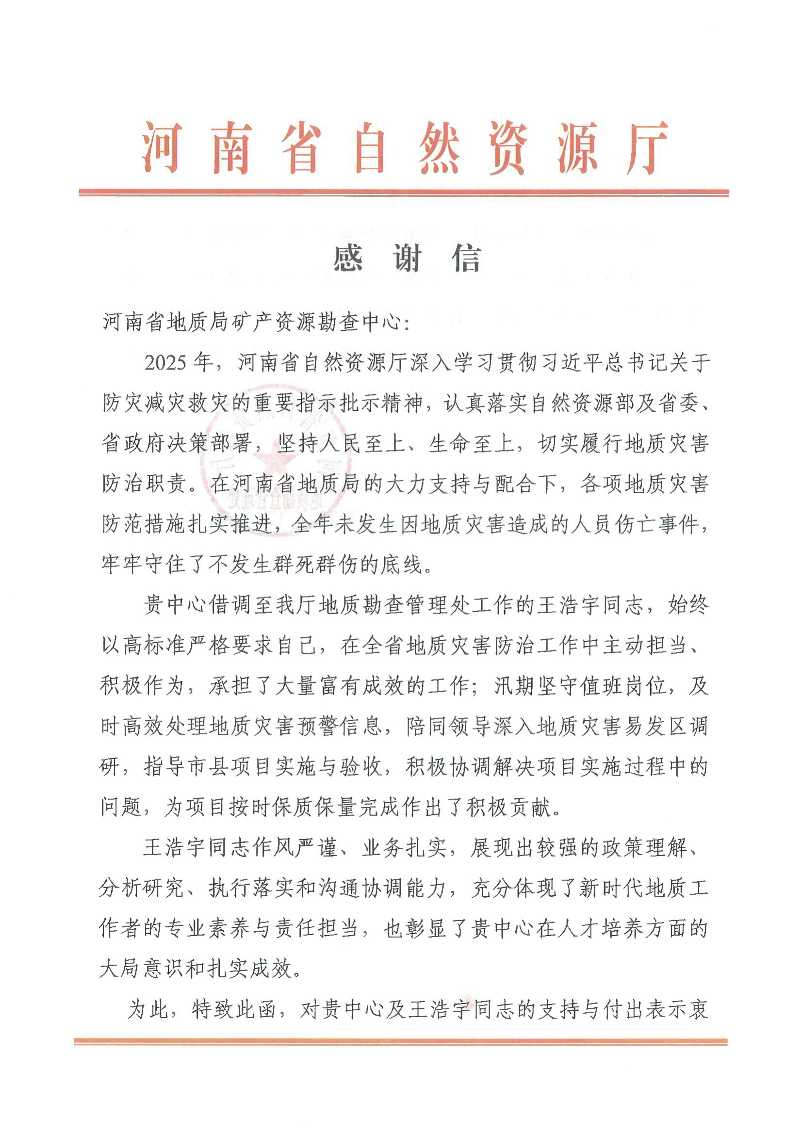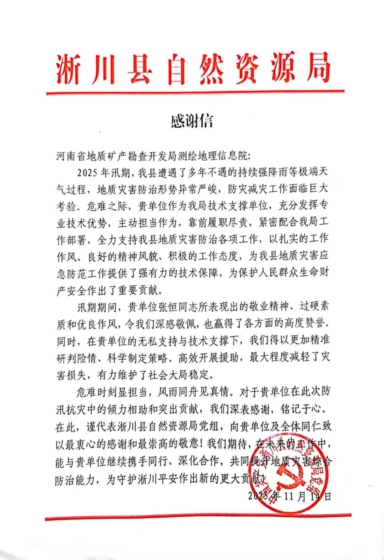 元旦将至,喜讯频传。近日,中心接连收到来自新疆塔城地区自然资源局、河南省自然资源厅以及郑州市、南阳市、三门峡市、淅川县等自然资源和规划局发来的感谢信。这一封封情真意切、赞誉有加的信件,不仅是对中心刘玉勇、宋利睿、葛俊涛、王浩宇、张雨沛、郝璐、曹涛、王胤博、张锐、张恒等同志个人辛勤付出与突出表现的充分肯定,更是对中心长期以来发挥专业技术优势,深度融入地方经济社会发展所取得成效的高度认可。