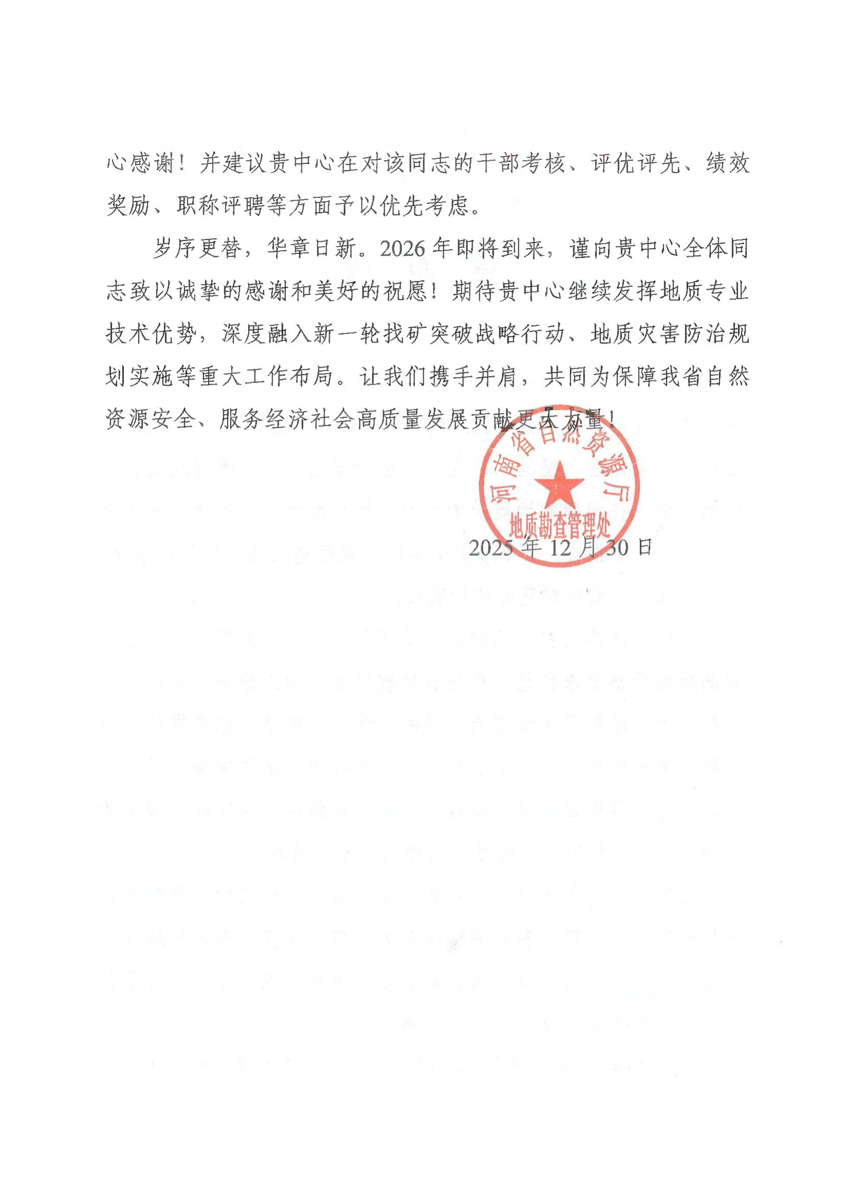 成绩属于过去,奋斗赢得未来。这一封封感谢信,是鼓励,更是鞭策;是肯定,更是期望。回首2025,我们步履坚实,硕果累累;展望2026,我们信心满怀,使命在肩。新的一年,中心干部职工将继续保持昂扬向上的精神状态,不断提升专业技术能力,持续深化与各相关单位的协同协作,以更加饱满的热情、更加务实的作风、更加优异的成绩,奋力在工作中展现新作为、作出新贡献,共同谱写河南地质事业更加绚丽的华章!