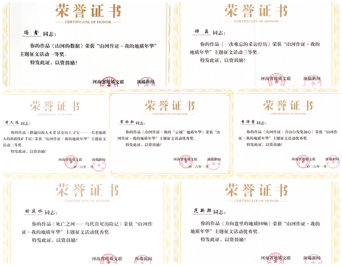 近日,由河南省地质文联与河南日报顶端新闻联合主办的“山河作证・我的地质年华”主题征文活动圆满落幕。中心多位职工凭借深厚的文字功底与真挚的情感表达,佳作频出、脱颖而出,分别斩获一等奖、三等奖及优秀奖多项荣誉,充分彰显了新时代地质人的初心本色、使命担当与文采风华!